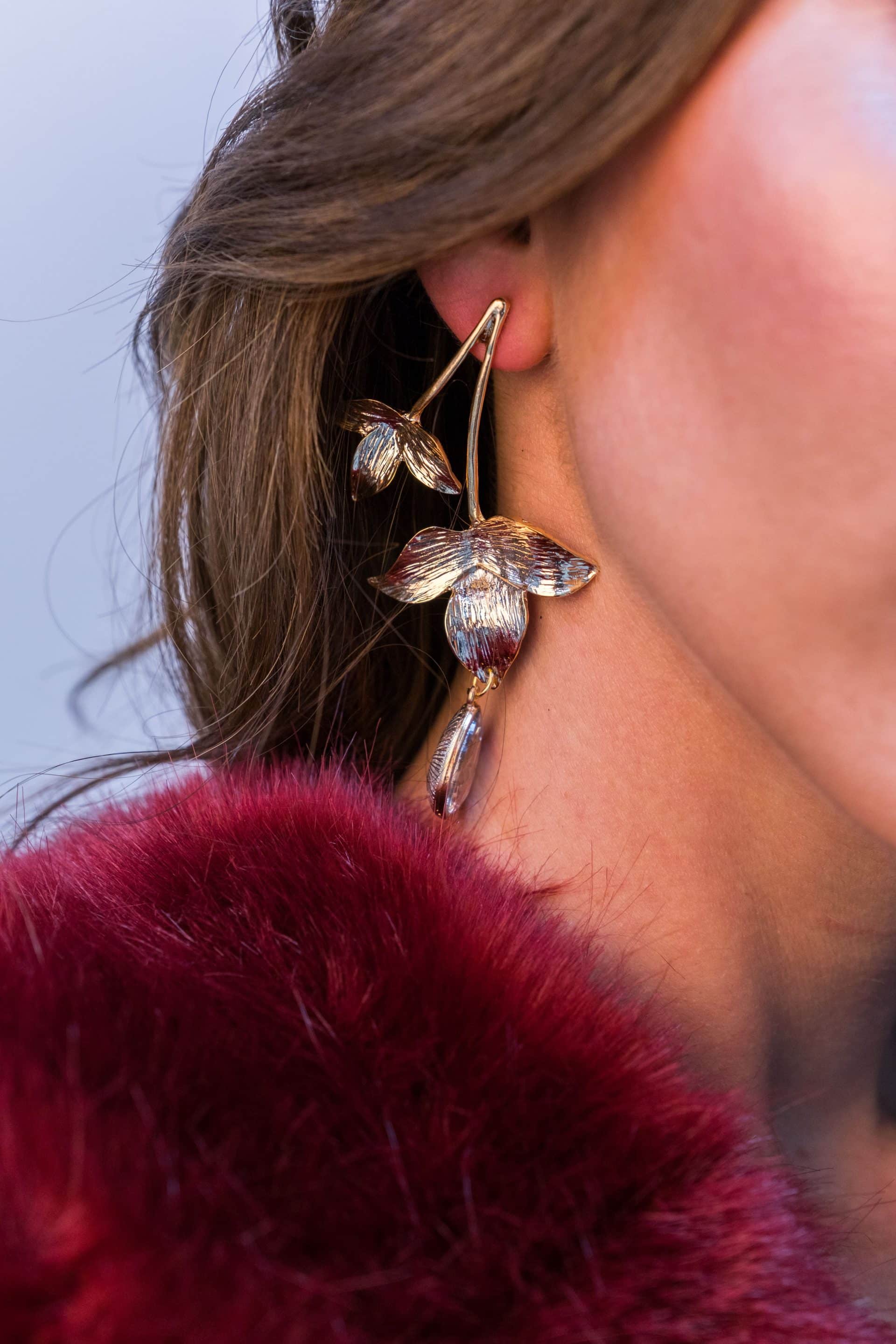 Precioso pendiente formado por dos ramas de diferentes longitudes con hoja, y rematado con cristal jade en color.