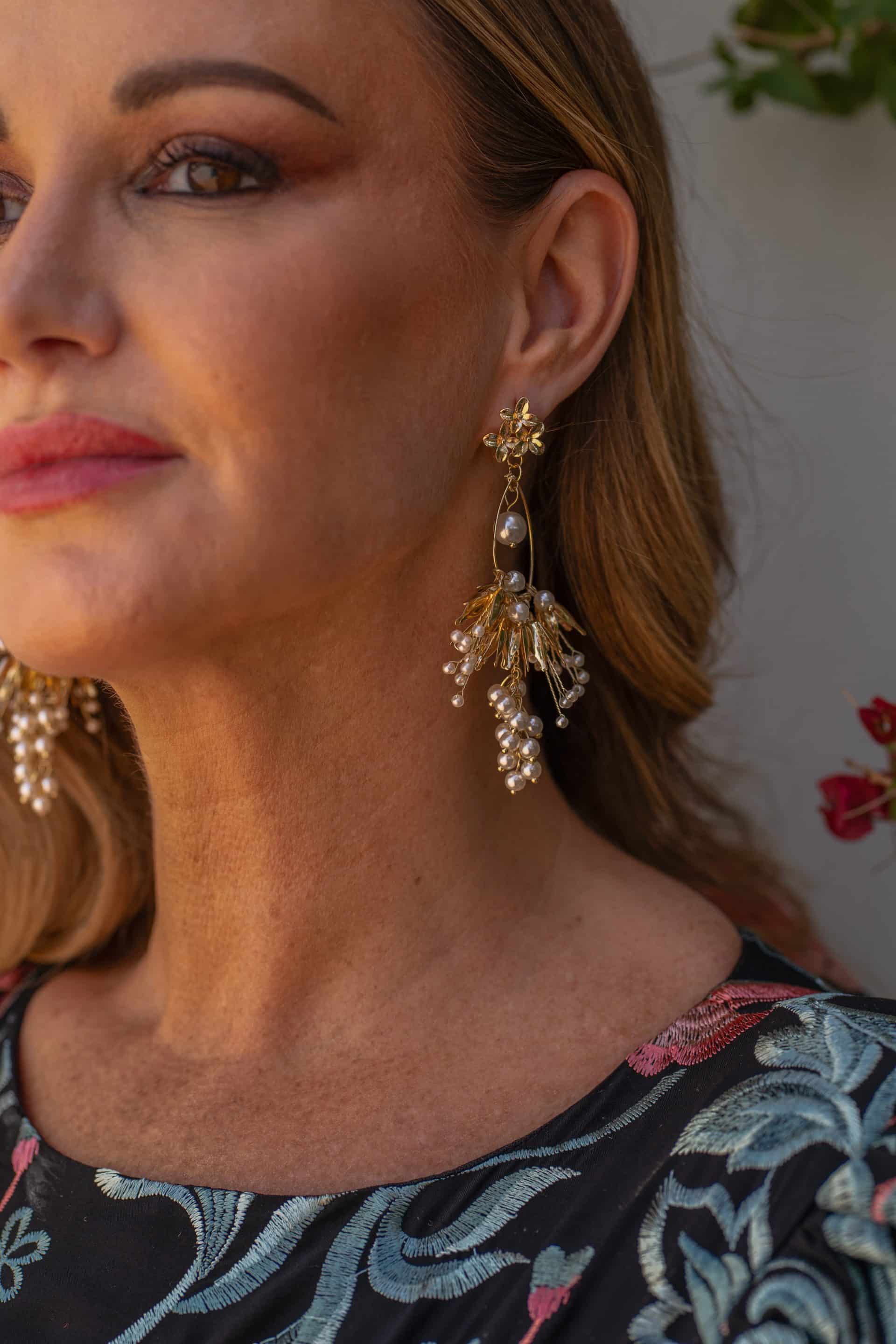 Formado por pendiente con flores, y rematado con aplique de perlas y aro dorado, que no necesitarán muchos más complementos para hacerte lucir increíble.