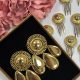 Pendientes elaborados a mano en nuestro taller, con detalle de tres lágrimas doradas de diferentes tamaños rematando una base circular con tacha dorada central.