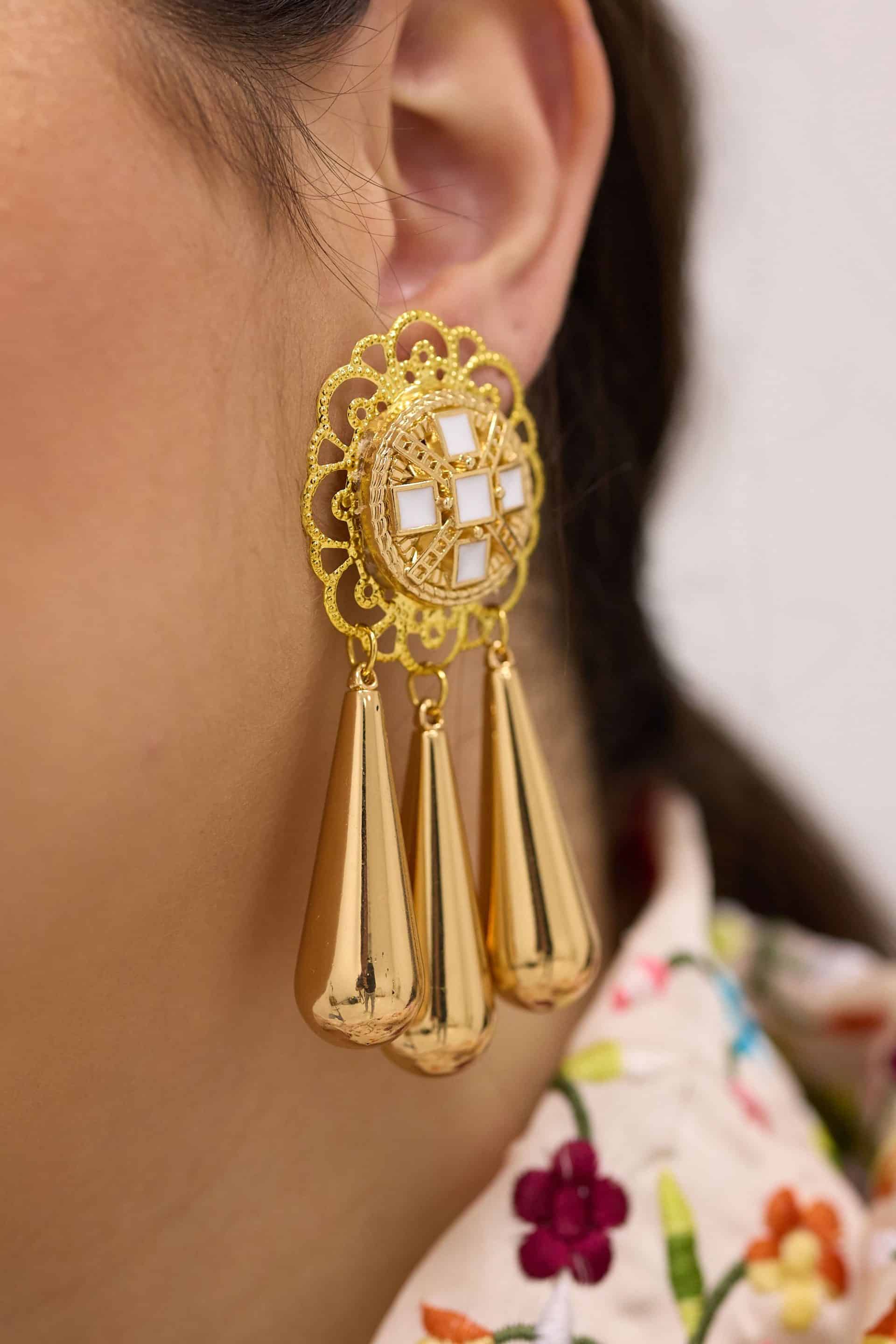 Pendiente con detalle central en color dorado y blanco, o dorado y negro, rematado con tres lágrimas doradas y sobre base brocada de forma ovalada.