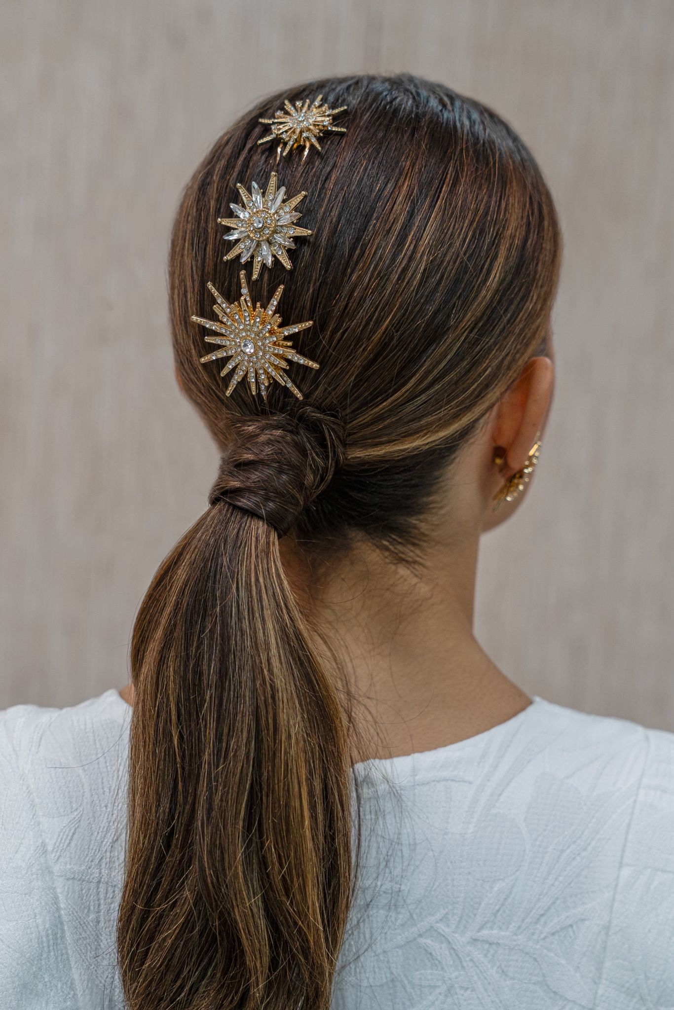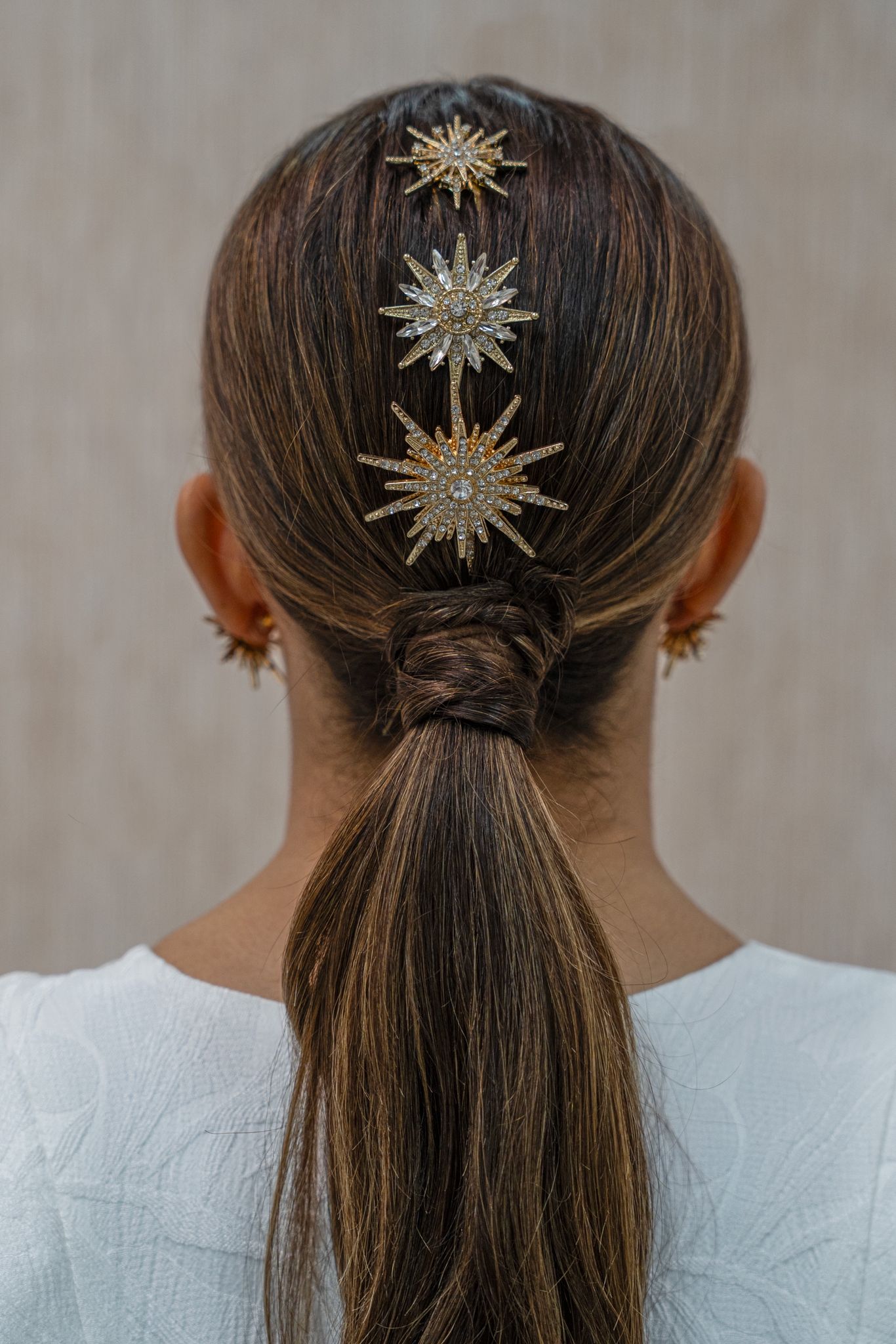 Las horquillas de estrellas funcionan súuuper bien en recogidos, semirecogidos y como detalle en un ladito de la cabeza. Lo divertido es que las puedas llevar a la prueba de peinado para que tu peluquero/a las coloque de mil y una formas hasta dar con la combinación que más te encaje.