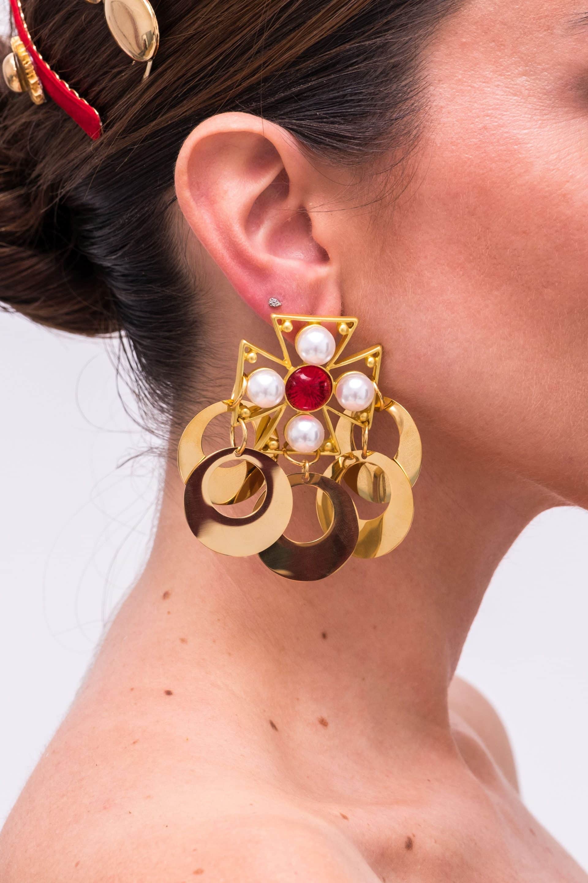 Formado por pendiente en forma de cruz, con detalles en perla y piedra central en color, rematado con aros en color dorado.