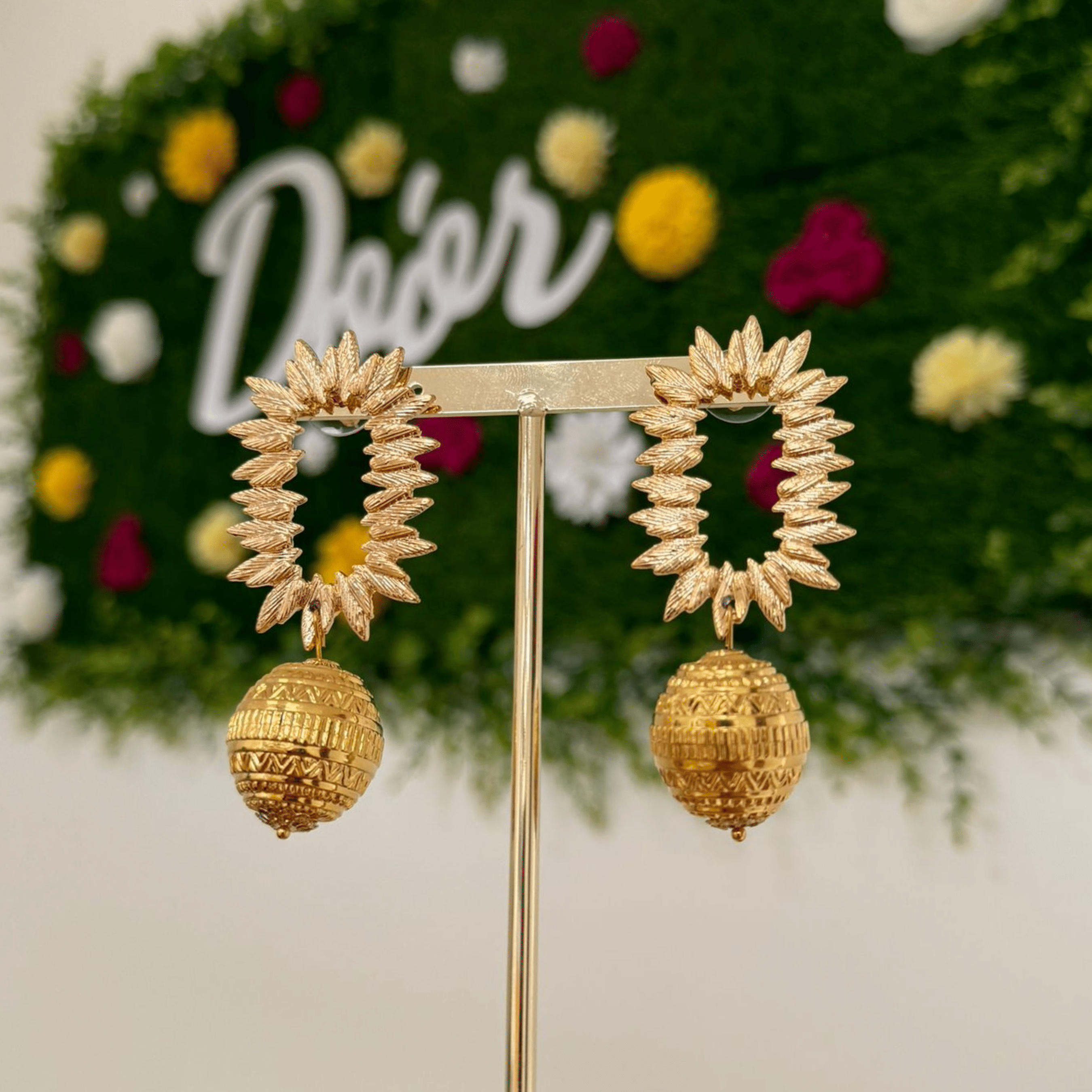 Precioso pendiente dorado, con forma de destellos, rematado con piedra arabesca de 2,5cm.