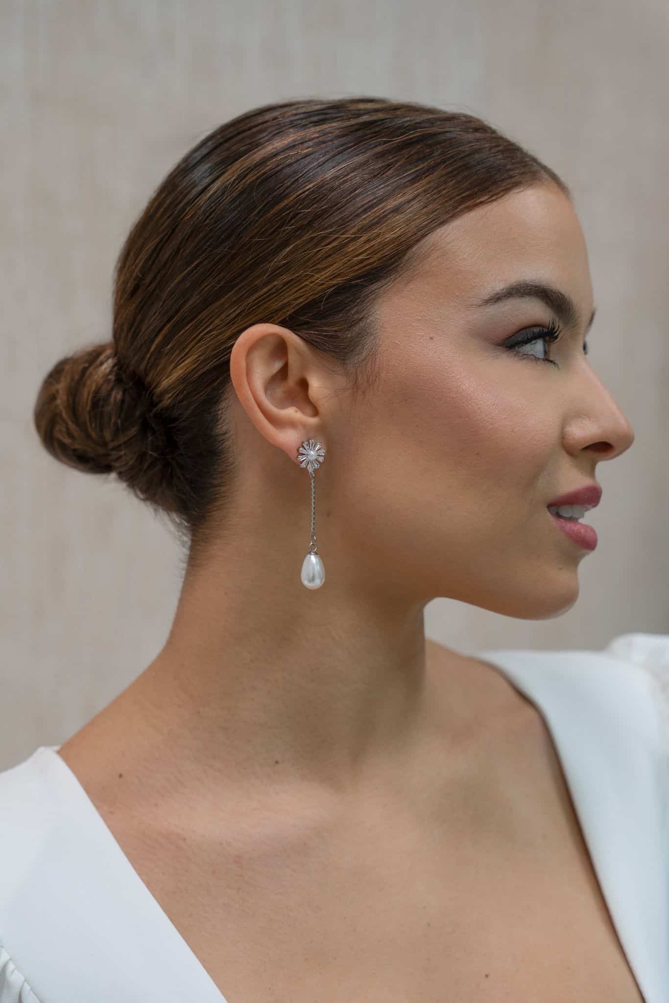 Pendientes con forma de margarita con perla central, perla en forma de lágrima y entre pieza trenzada.