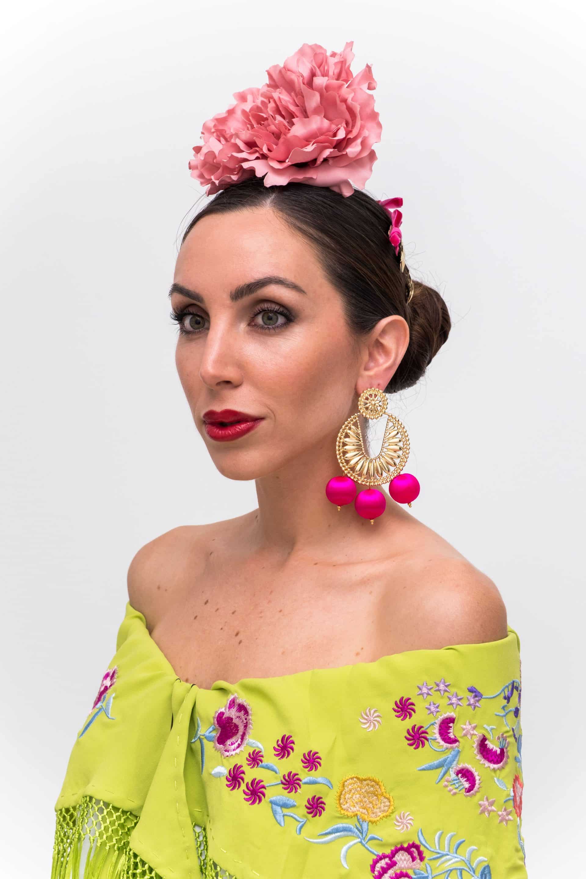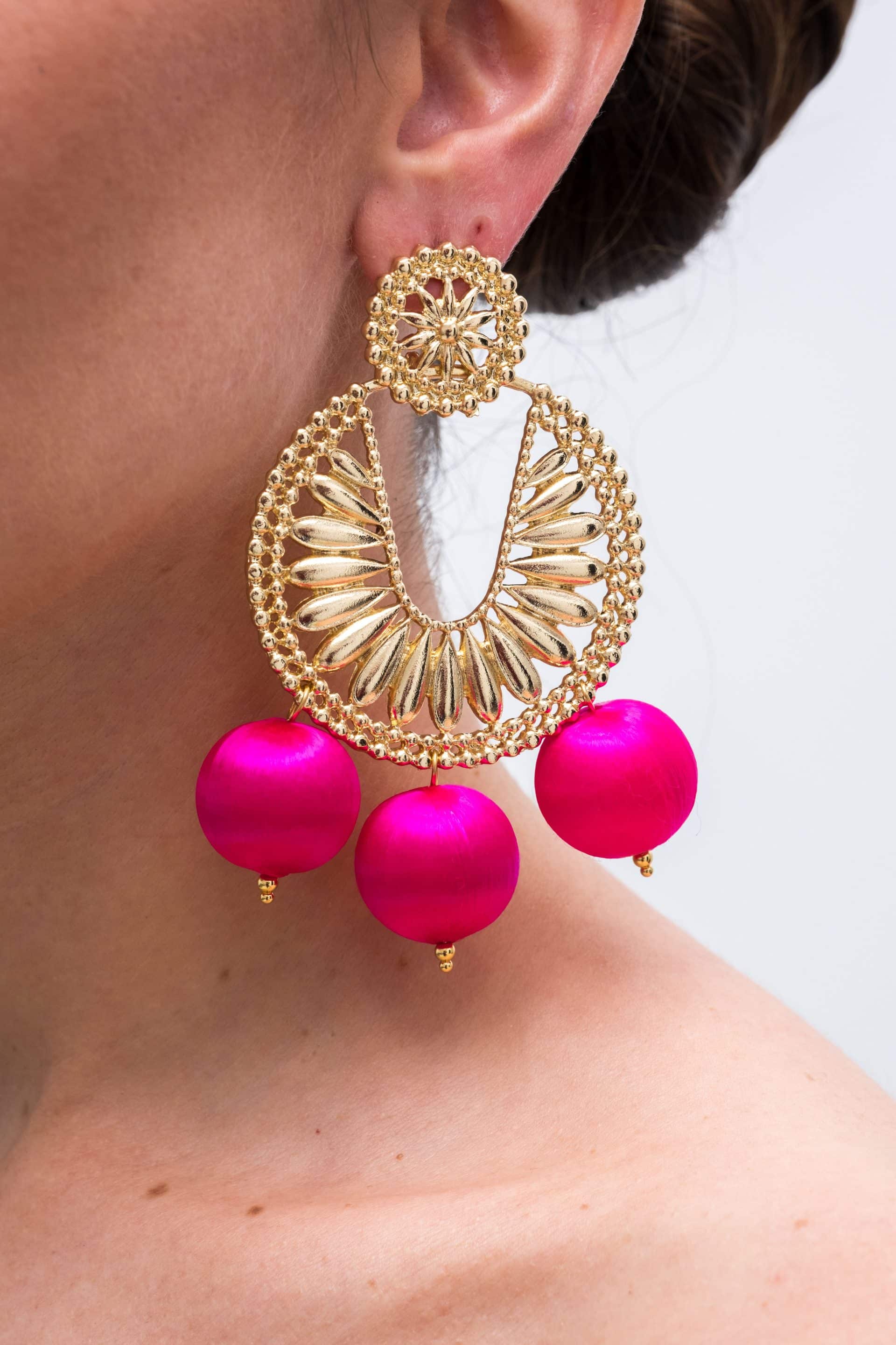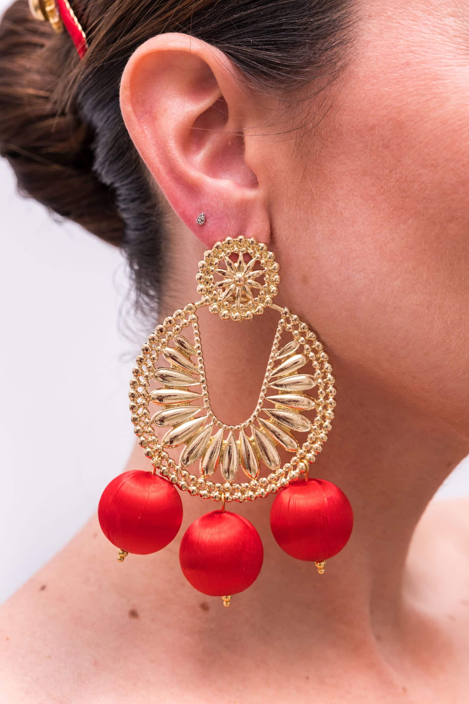 Original pendiente en color dorado, rematado con bolas de tejido en diferentes colores.
