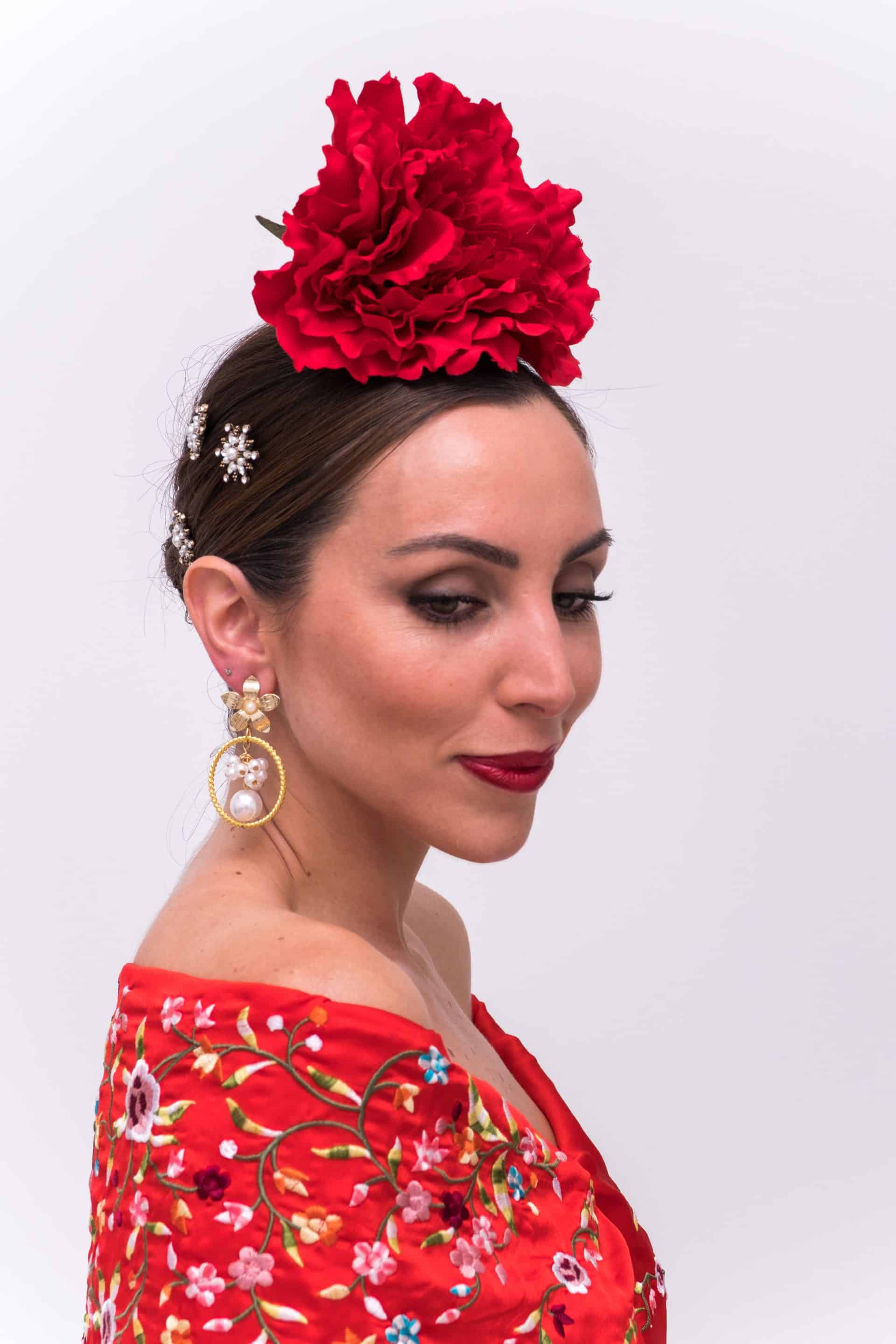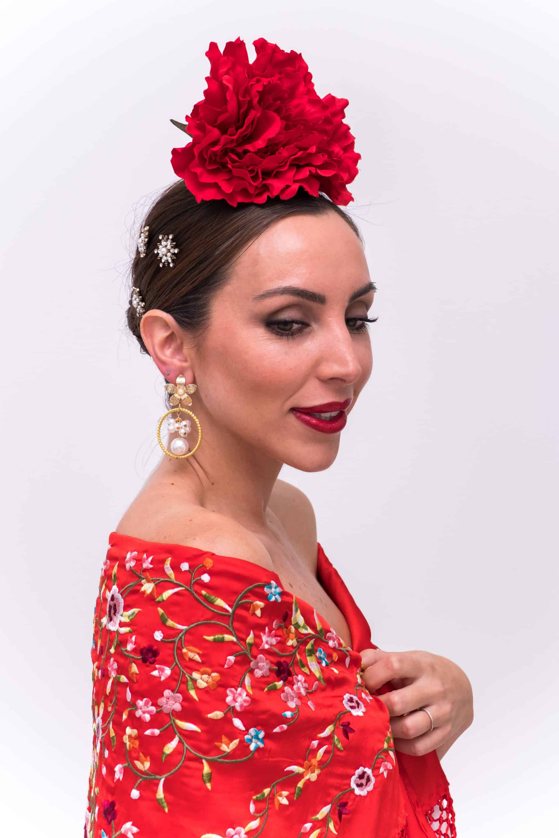 Pendiente con forma de flor y detalles de aro dorado brocado y perlas en diferentes tamaños.