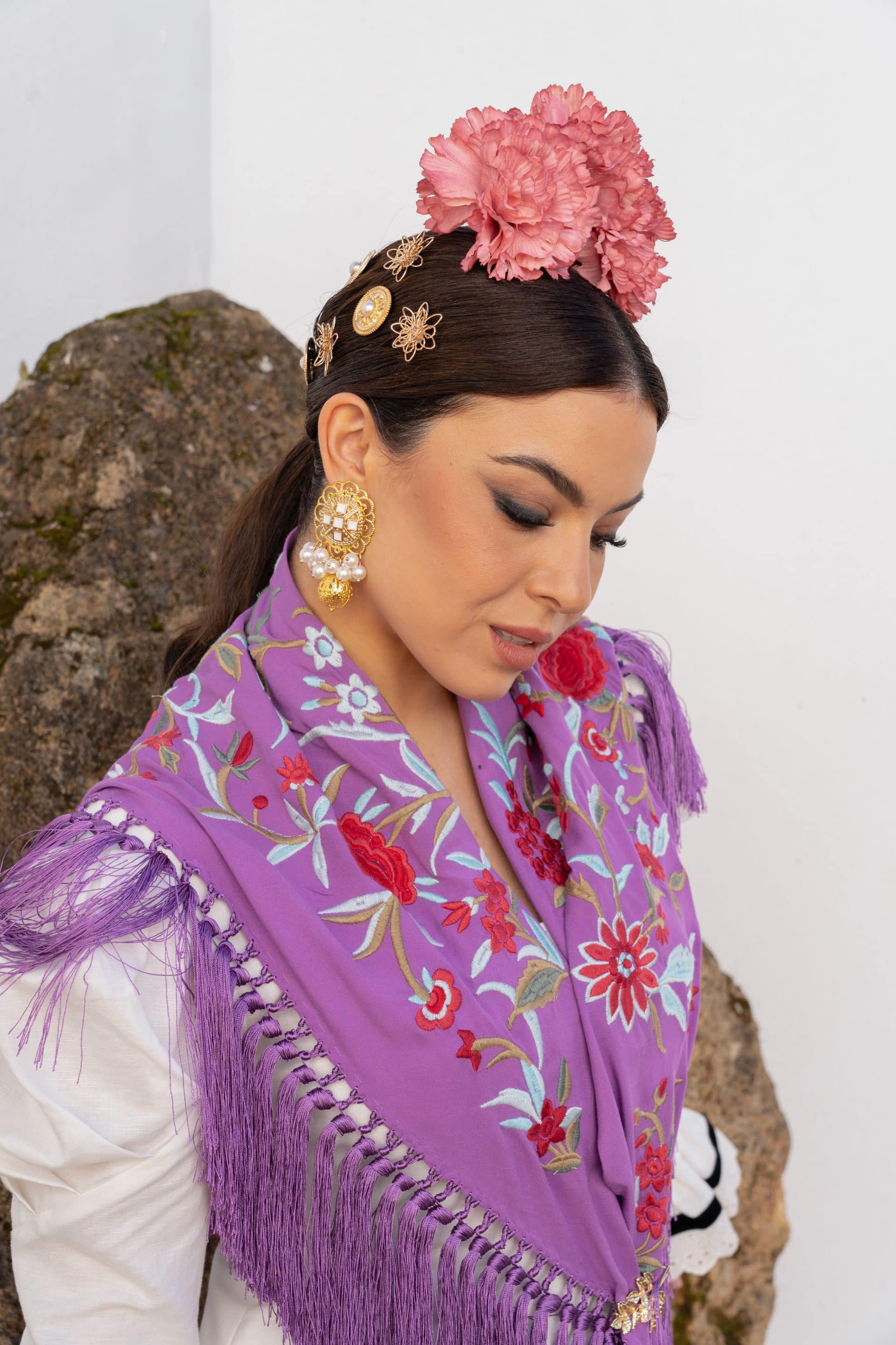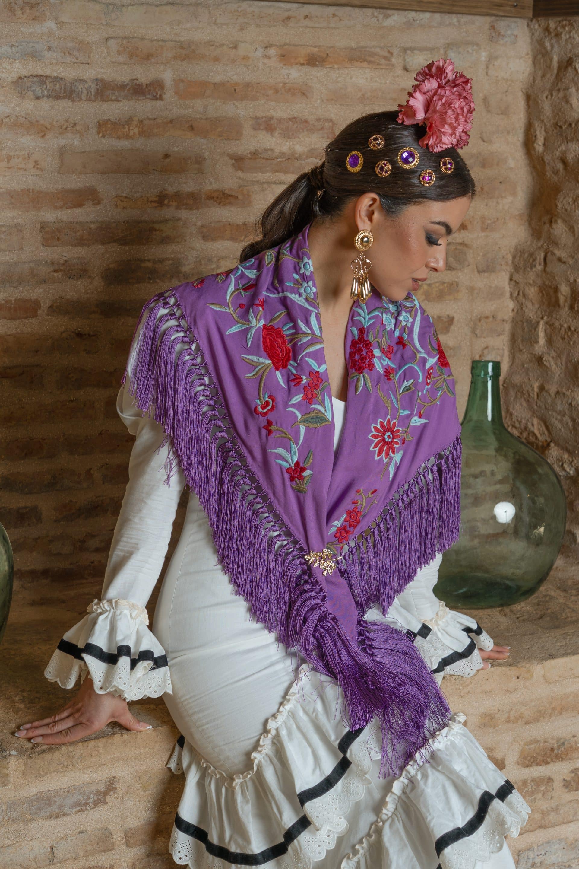 Mantoncillo de seda bordado en seda y flecado a mano