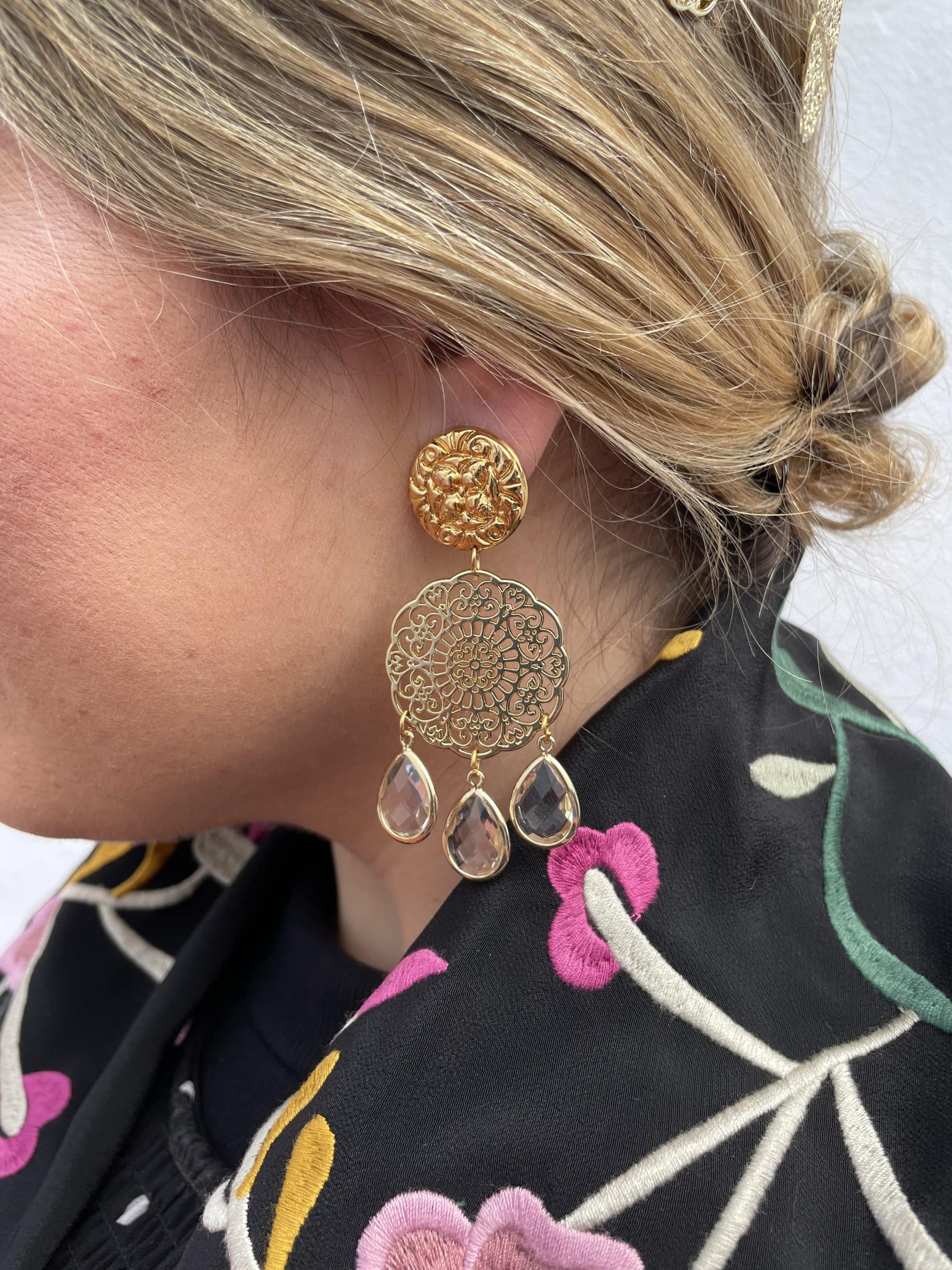 Formado por pendiente brocado, entrepieza dorada y rematado con piedras de cristal facetados.