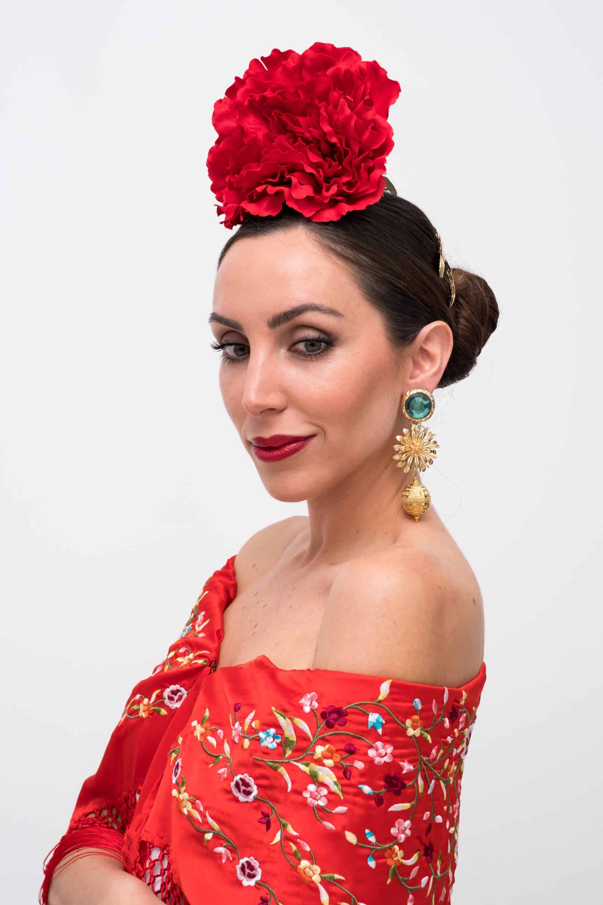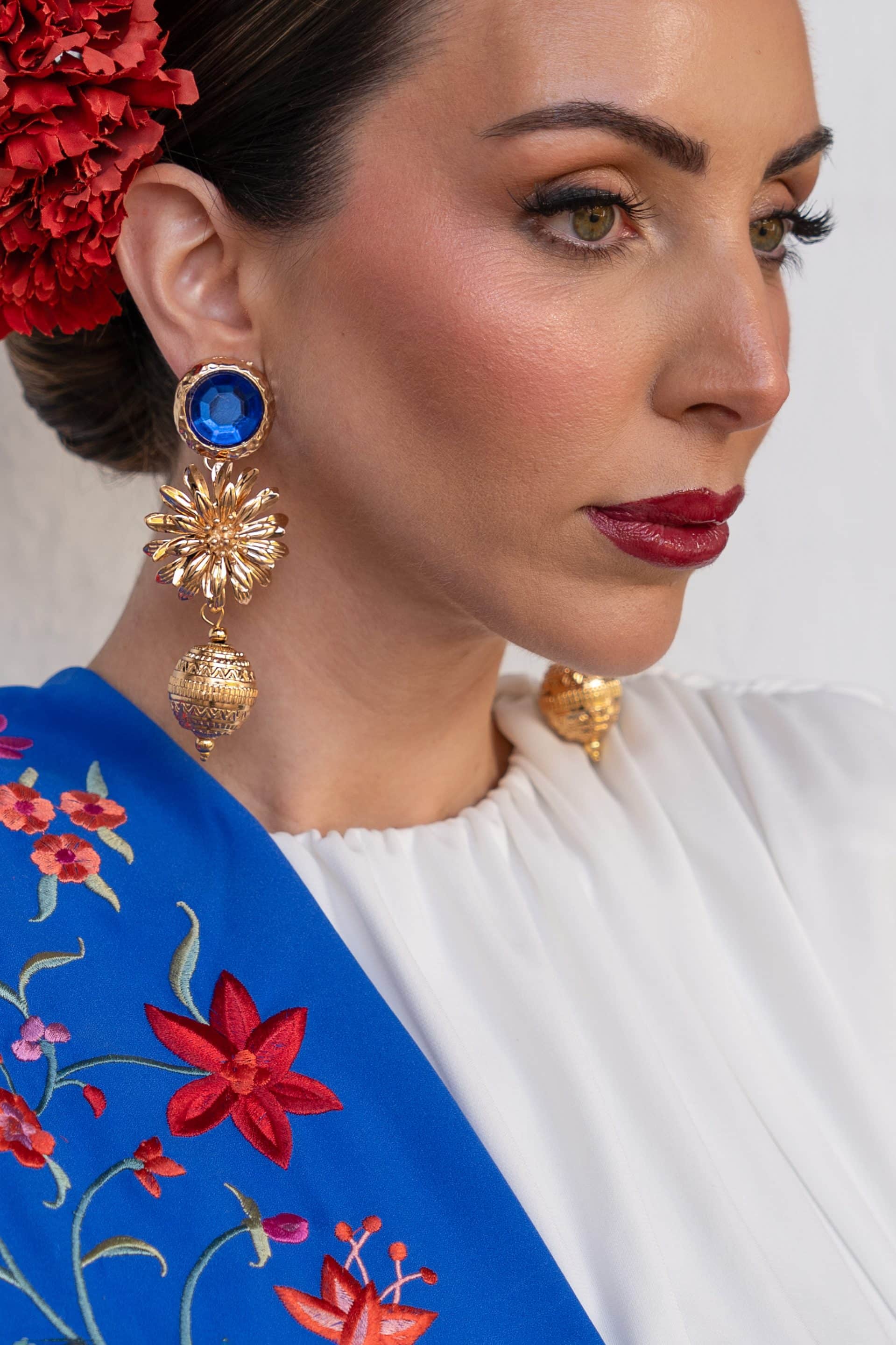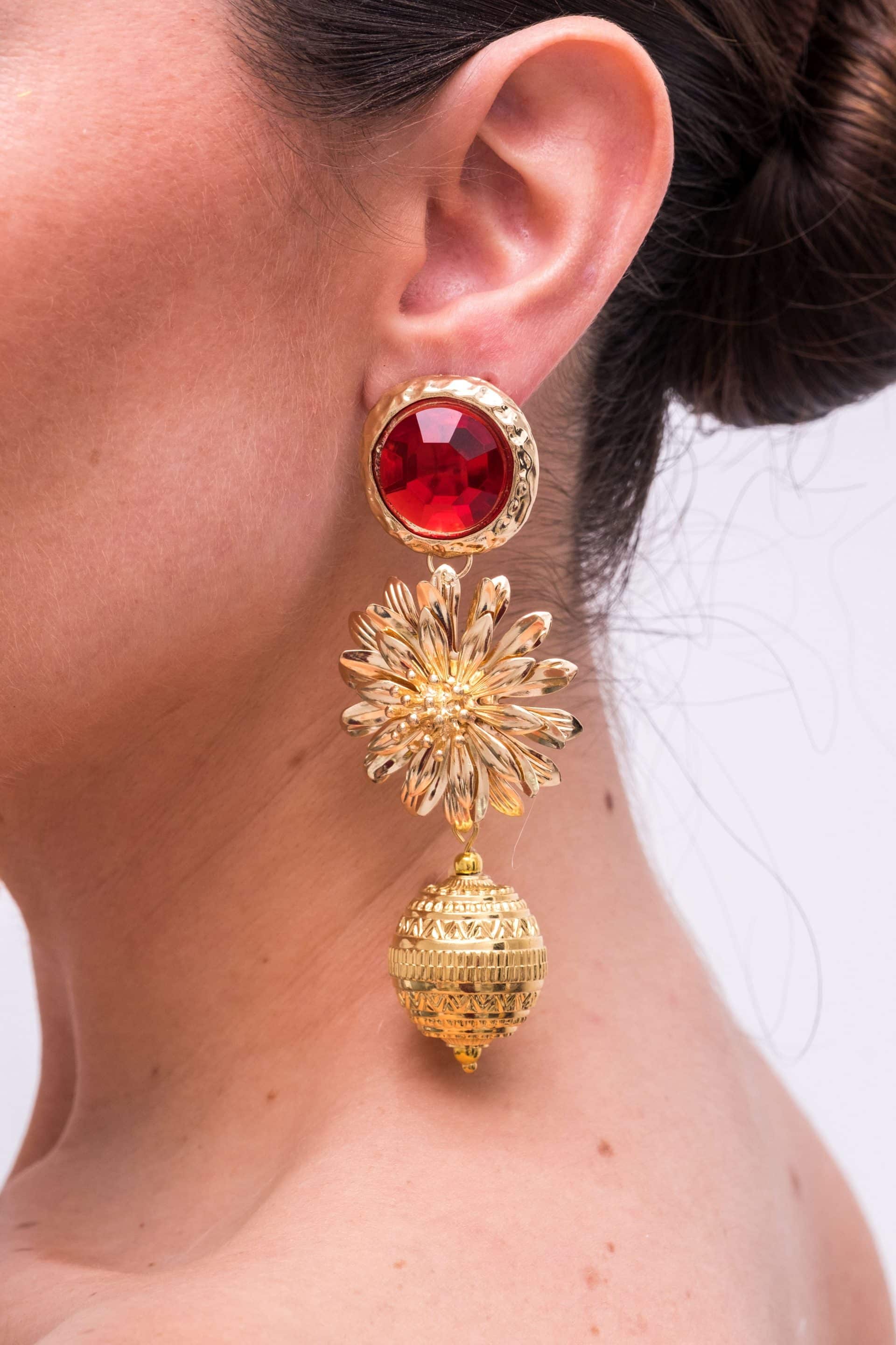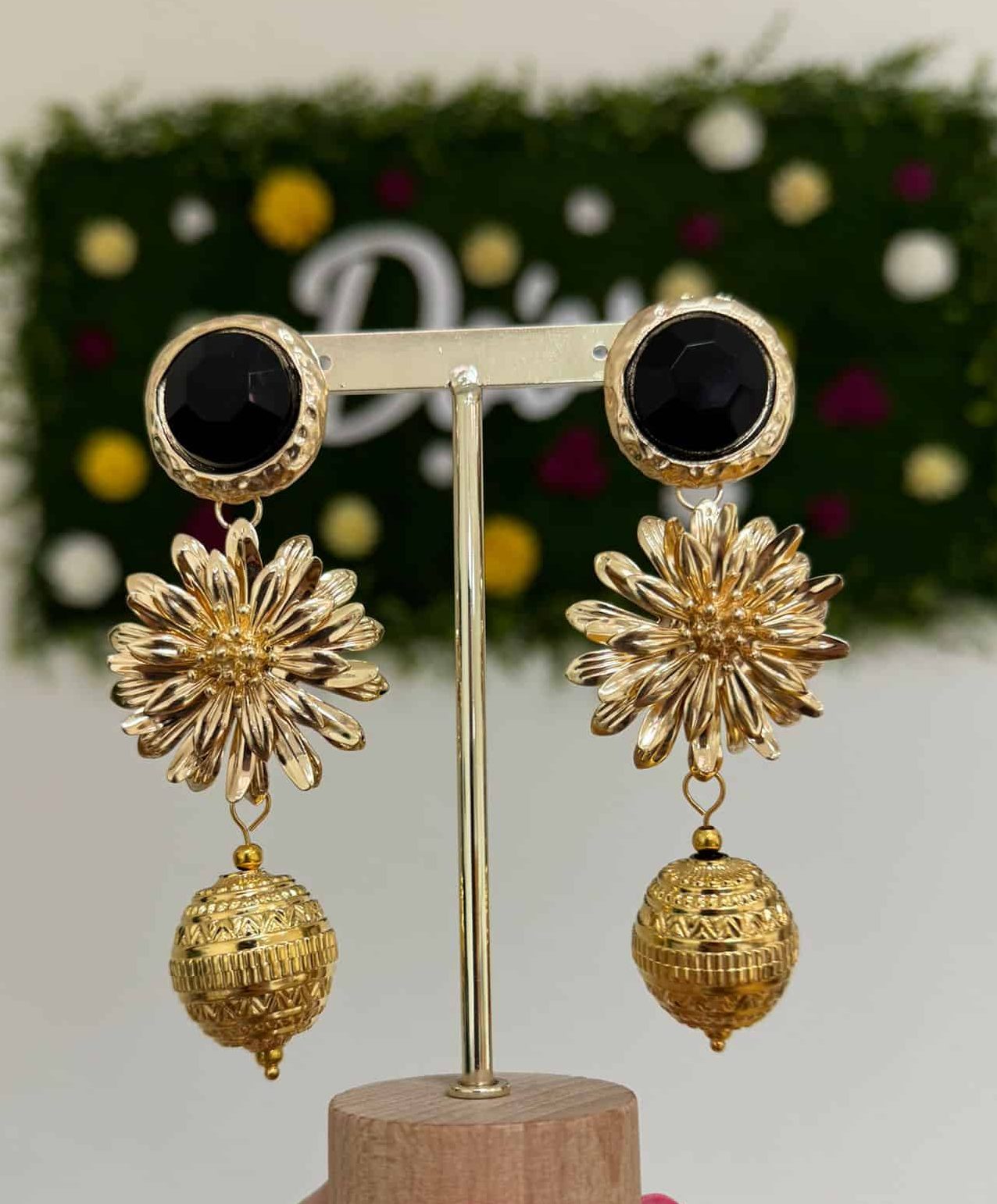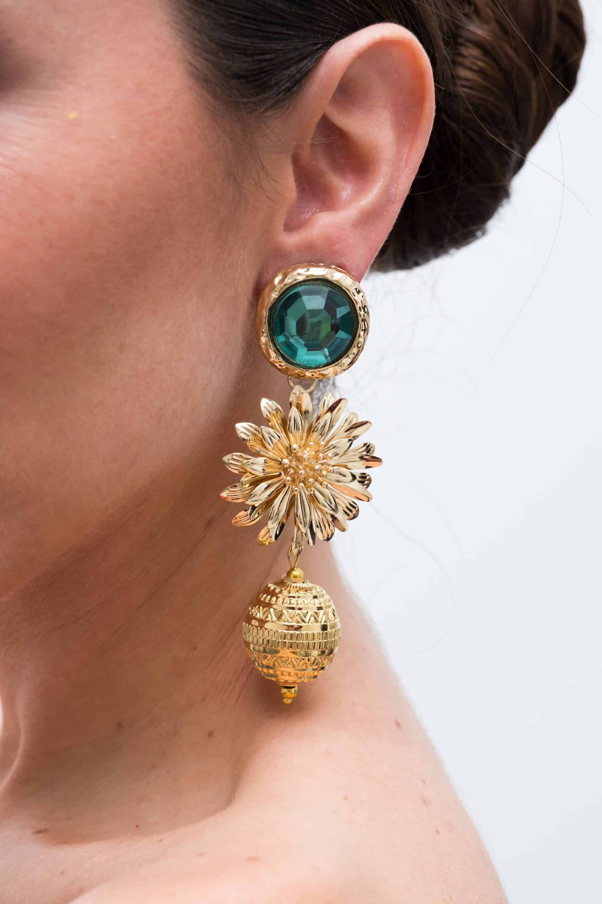Original pendiente formado por engarce de piedra en color, con flor dorada y bola arabesca.