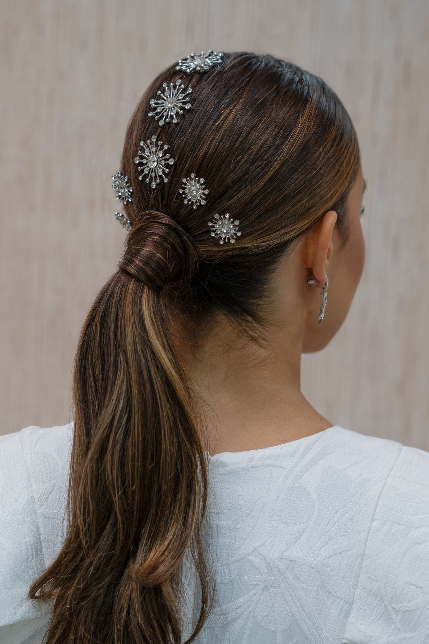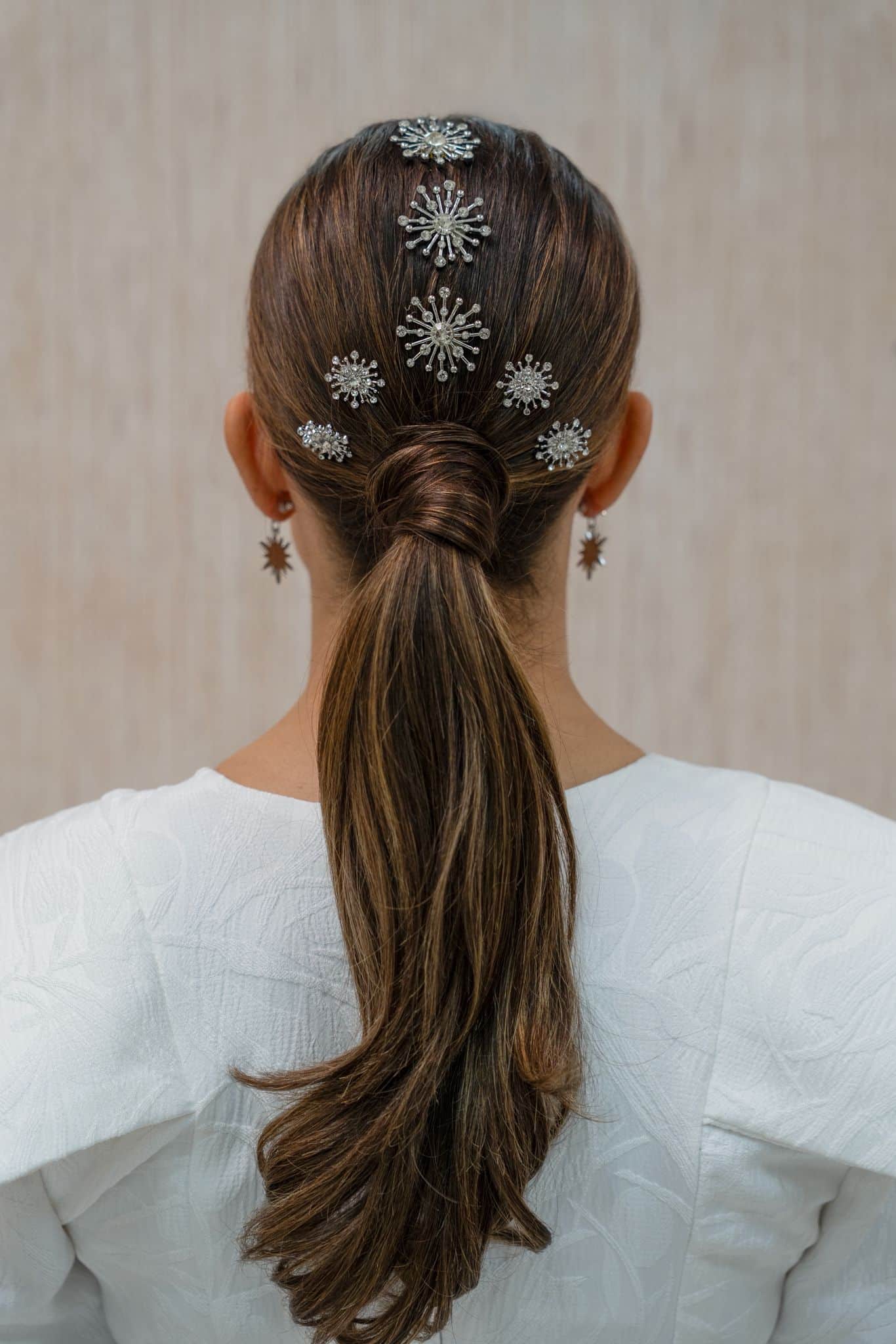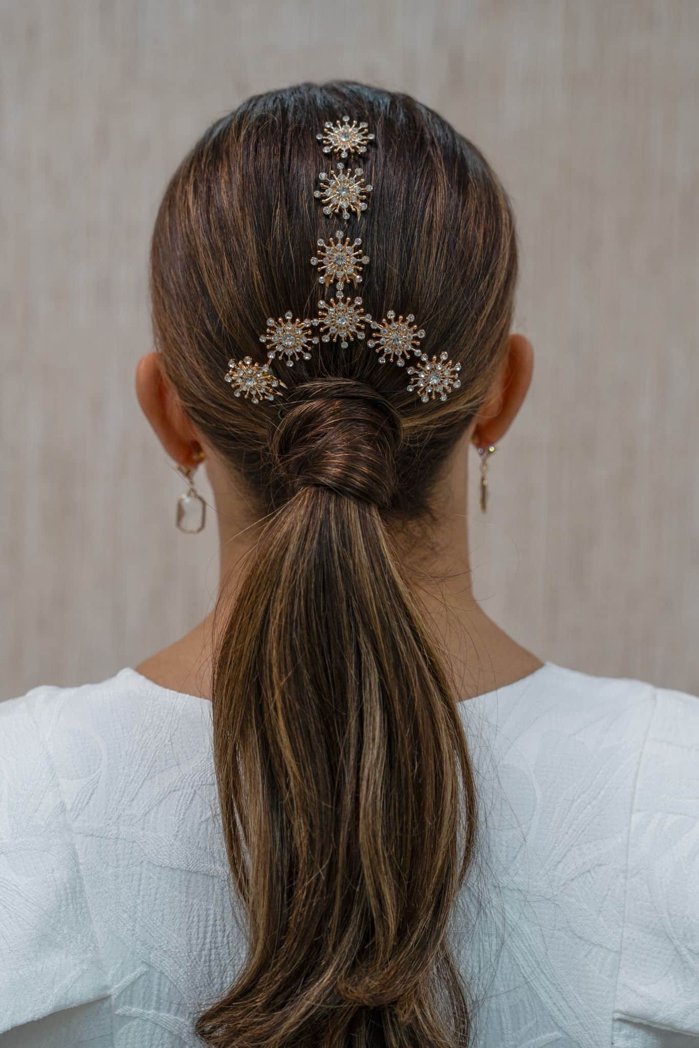 Nota: en la imagen la opción dorada aparece combinando la cresta trasera Pandora con 3 peinecillos pequeños.