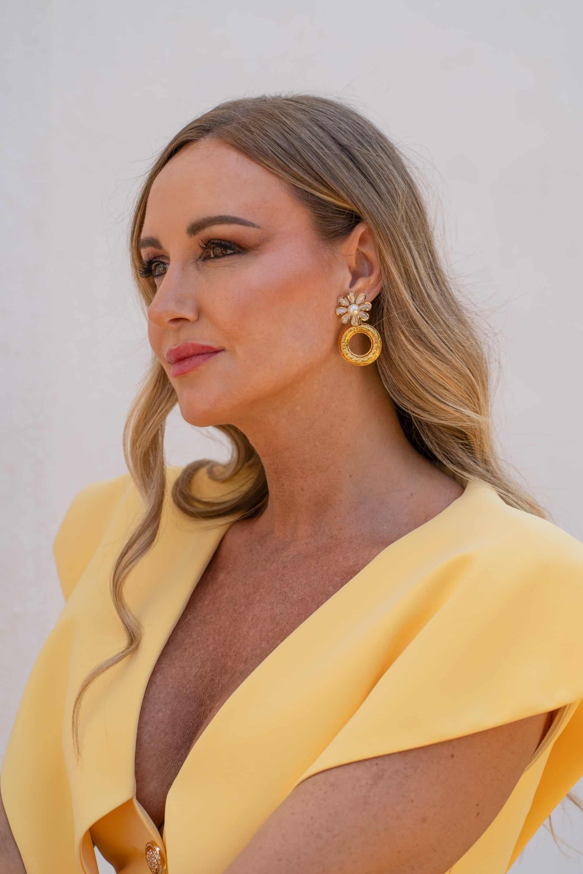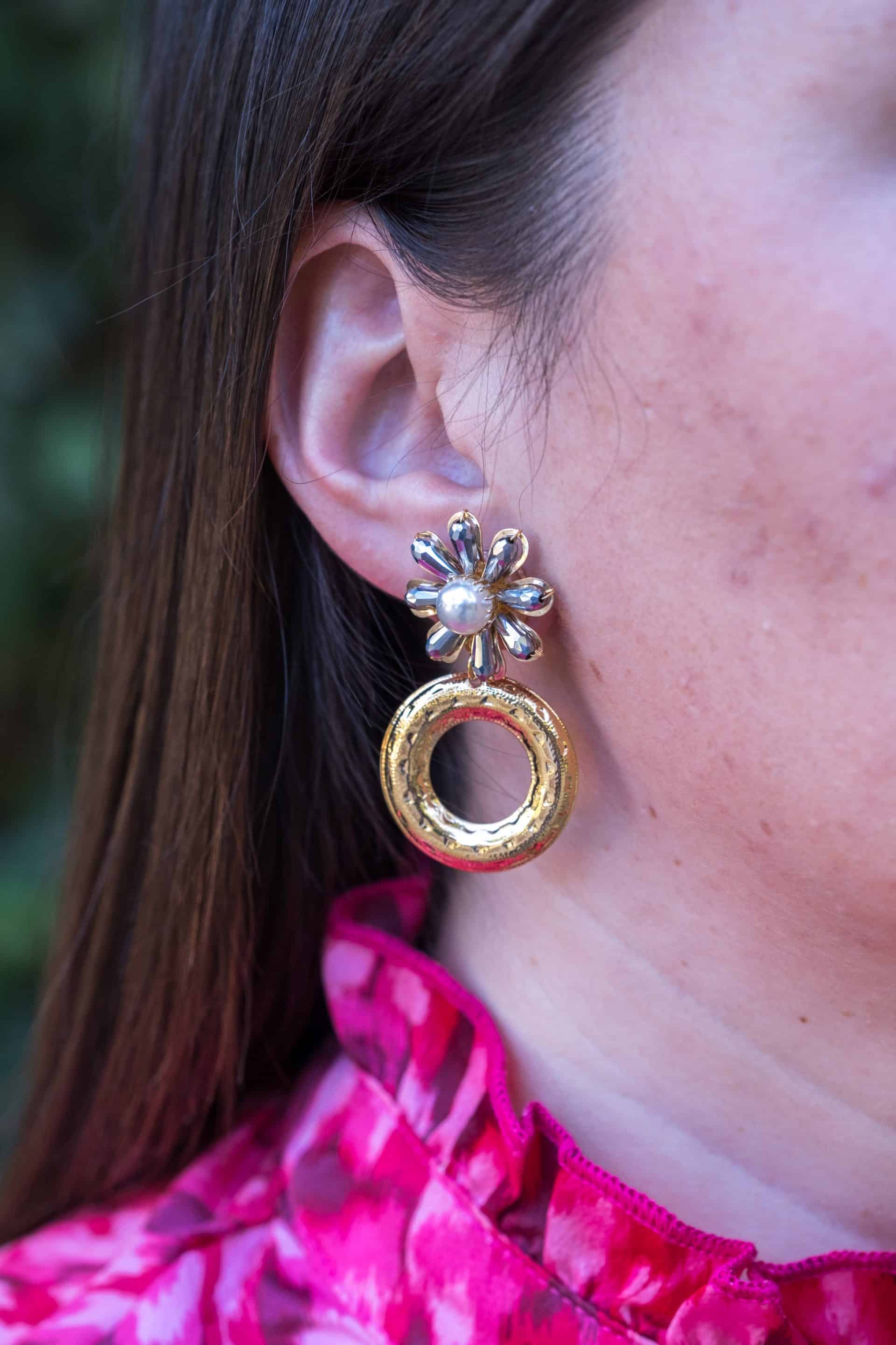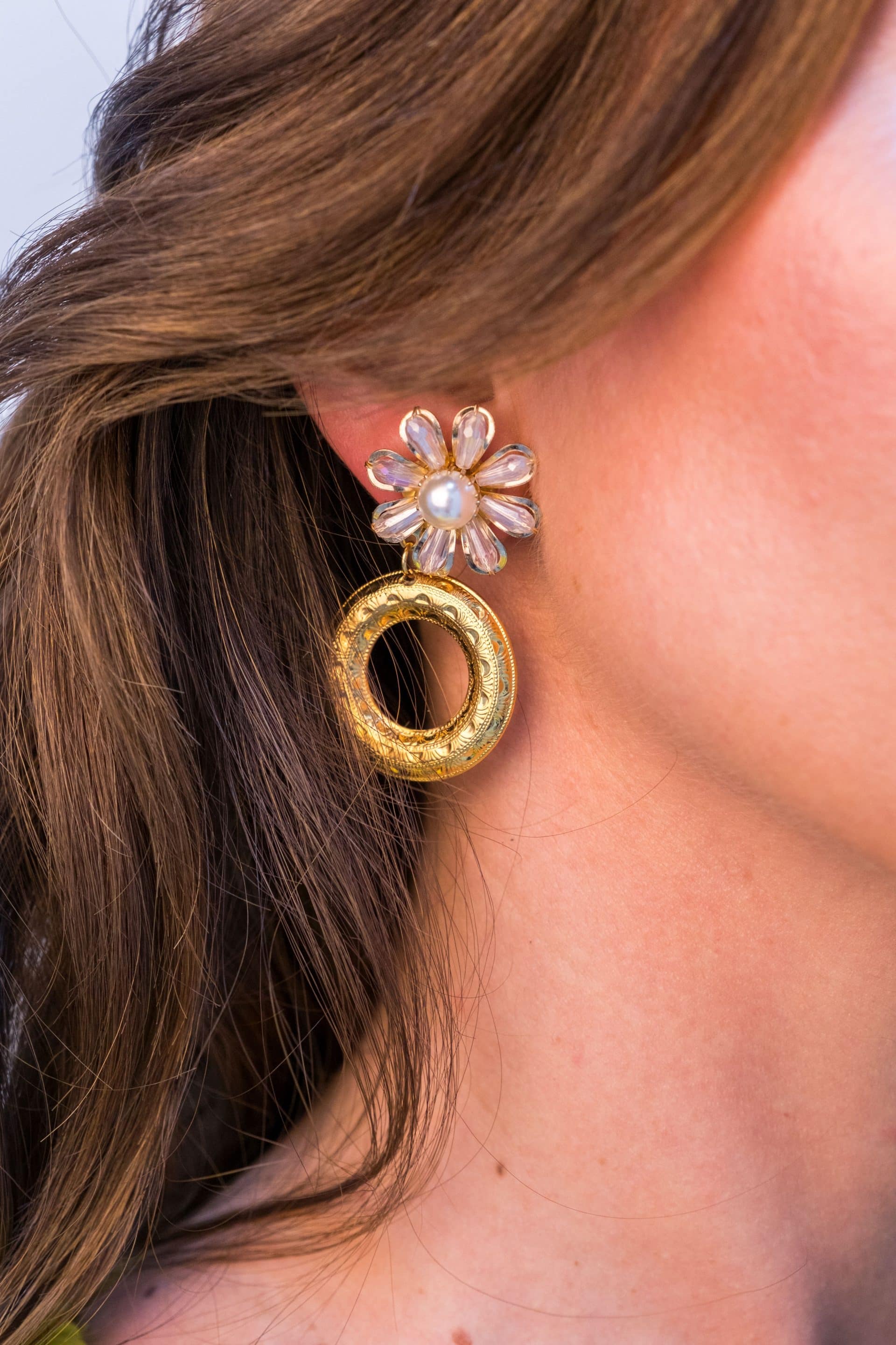 Formado por margarita de color con pieza central perlada, rematado con aro dorado brocado.